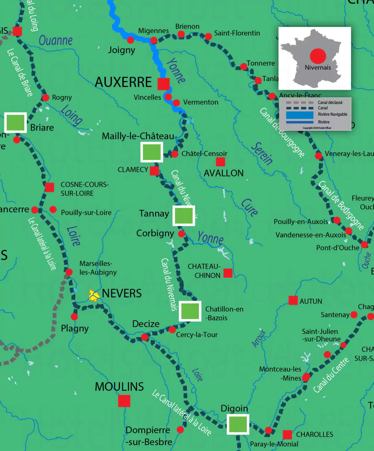 Les canaux de la région du Nivernais sont tout simplement magnifiques. Le Canal du Nivernais permet la connexion entre les bassins de la Loire et de la Seine tout en remontant tranquillement le parc naturel du Morvan. Plein d'histoires et d'Histoire, le canal construit à la fin du XVIIIe siècle servait au transport du bois du Morvan jusqu'à Paris. Le canal de la Loire est lui aussi superbe. Il vous transporte au coeur du vignoble sancerrois. Plus au Sud, le Canal du Centre vous amène dans le Charolais. Il connecte la Loire et la Saône en traversant le vignoble chalonnais.