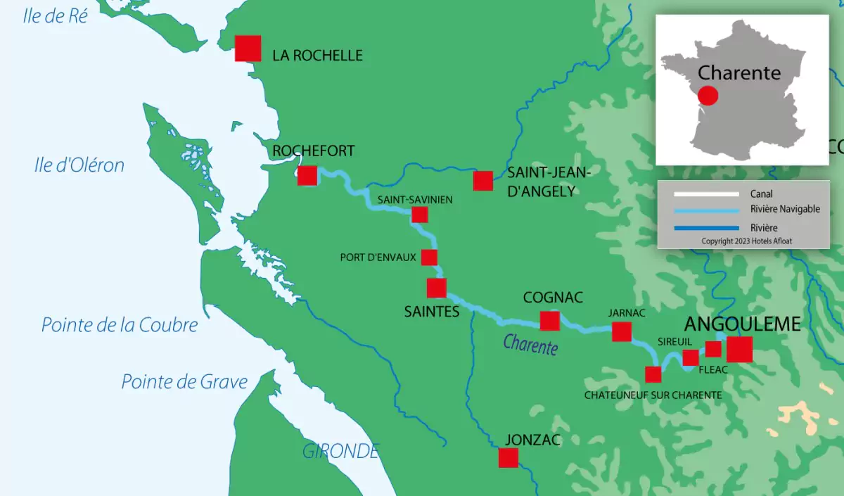 Région préservée, la Charente compte parmi les plus belles de France. Entre la Loire et la Garonne, la rivière Charente s'écoule calmement à travers Angoulême, jusqu'au vignoble de Cognac puis jusqu'à l'Atlantique. Profitez des distilleries, des châteaux de la Renaissance et des églises romanes qui ornent magnifiquement cette région.